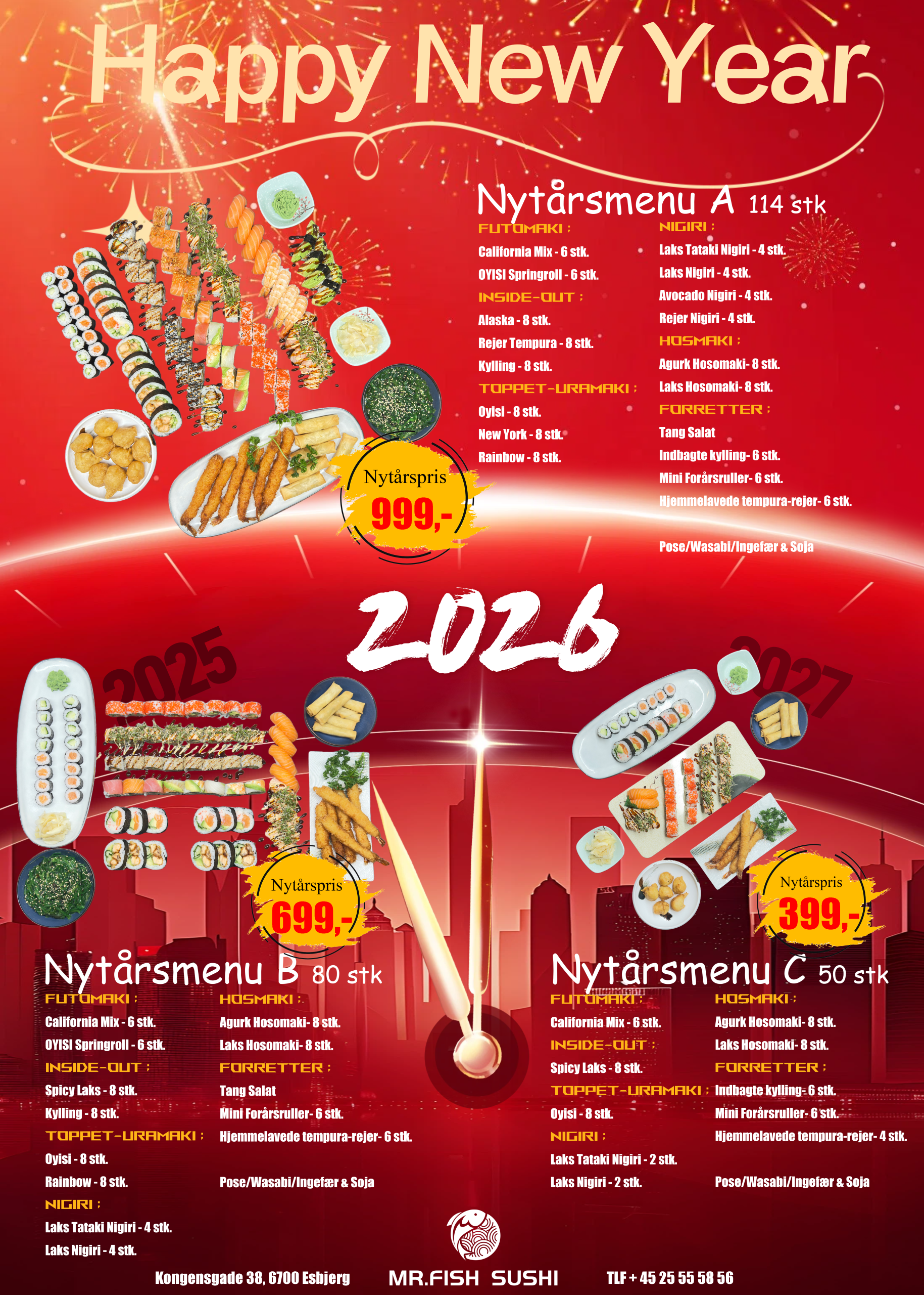 Ring til os eller læs mere på https://mrfishsushi-esbjerg.dk. Vi tilbyder dog kun take away d. 31. Dec, og det er derfor ikke muligt at spise i restaurantens. Afhentning af take away d. 31. Dec. 2025 er mellem kl 12.00 og 20.00.